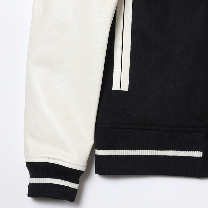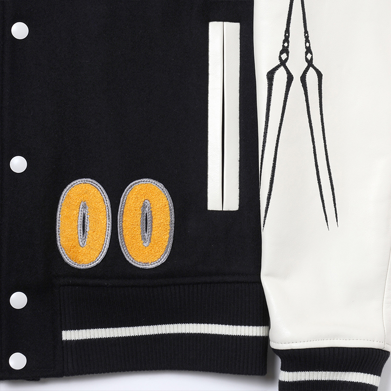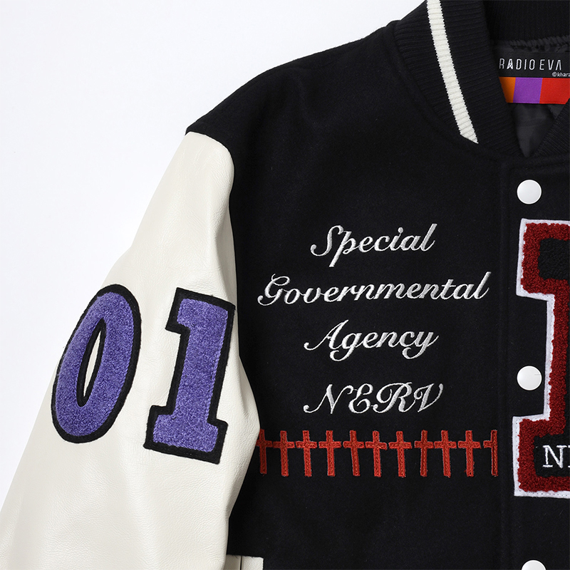 フロント、アームにはワッペンがふんだんに施され、随所にエヴァンゲリオンの要素を詰め込みました。またメインとなる素材にはたっぷりのウールを、そして両袖はラムレザーで仕上げられた贅沢な仕様となっています。