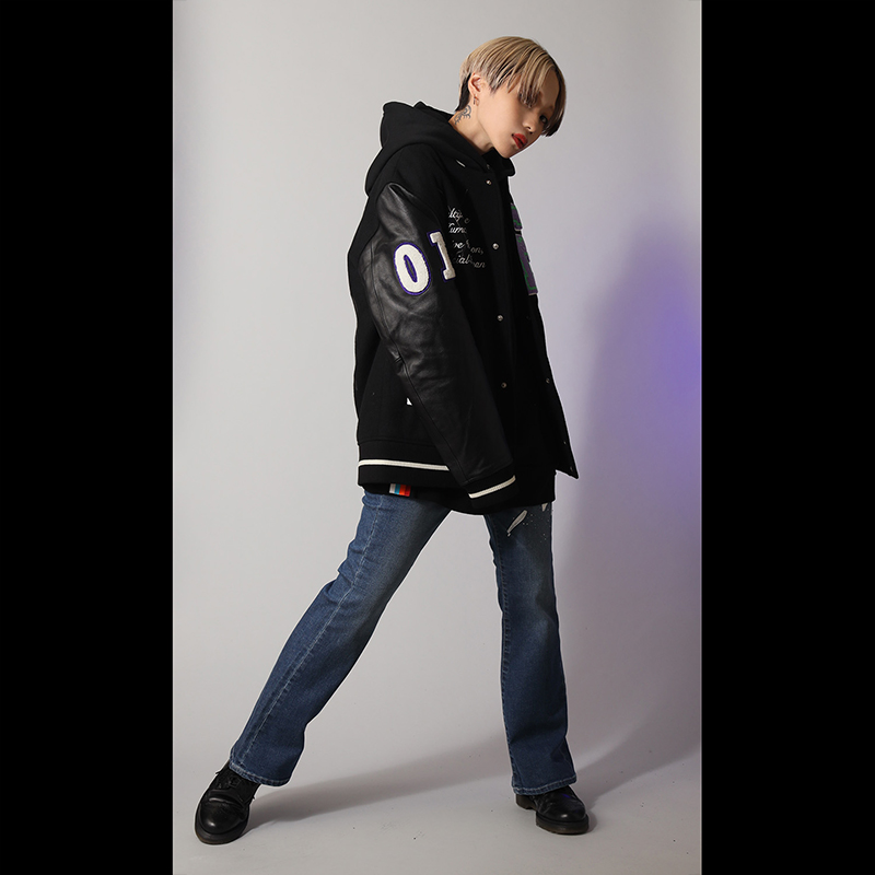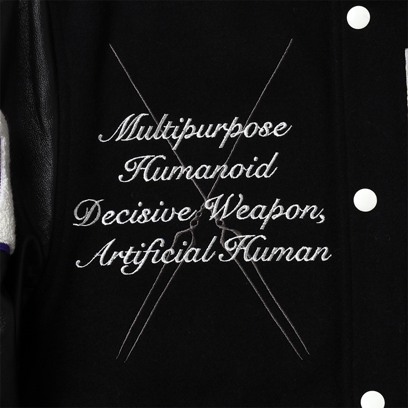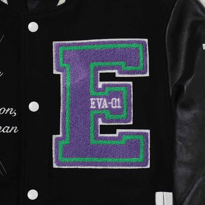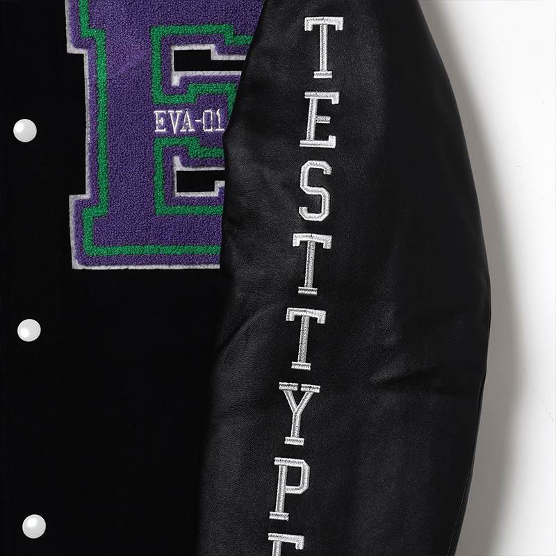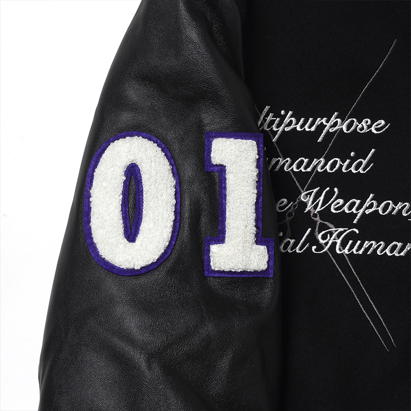 フロント、アームにはワッペンがふんだんに施され、随所にエヴァンゲリオンの要素を詰め込みました。またメインとなる素材にはたっぷりのウールを、そして両袖はラムレザーで仕上げられた贅沢な仕様となっています。