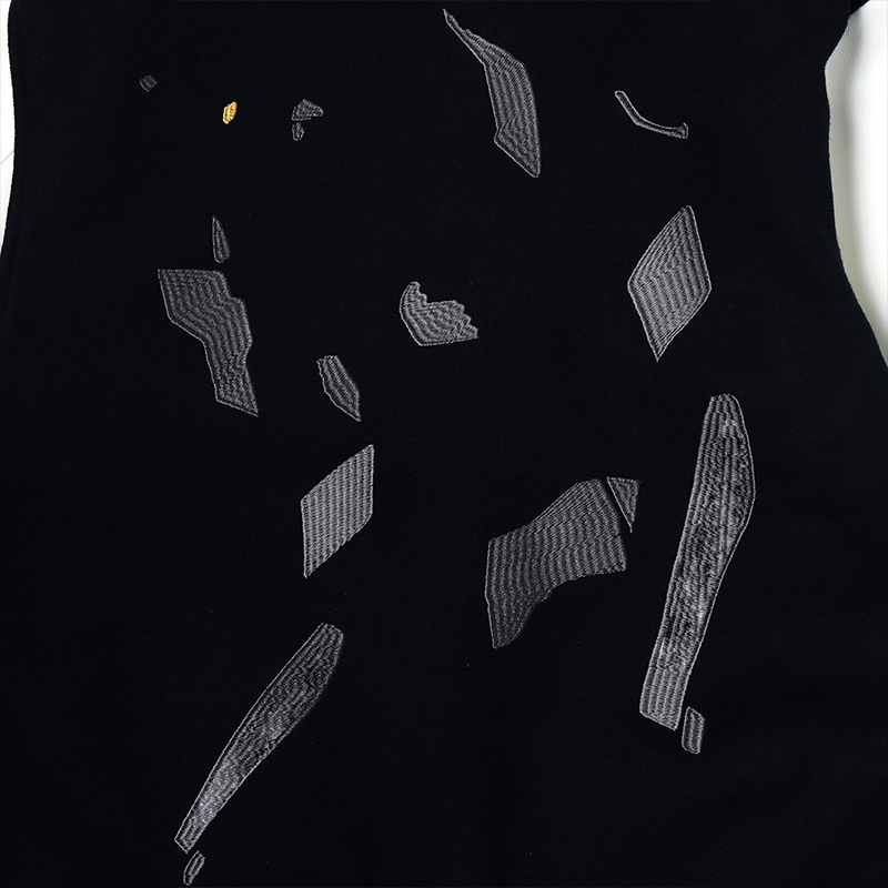 そして本作の1番の注目ポイントである背面には、暗闇に溶け込む初号機をイメージした闇夜デザインの初号機を同型色のチャコールグレーで全面に刺繍しました。