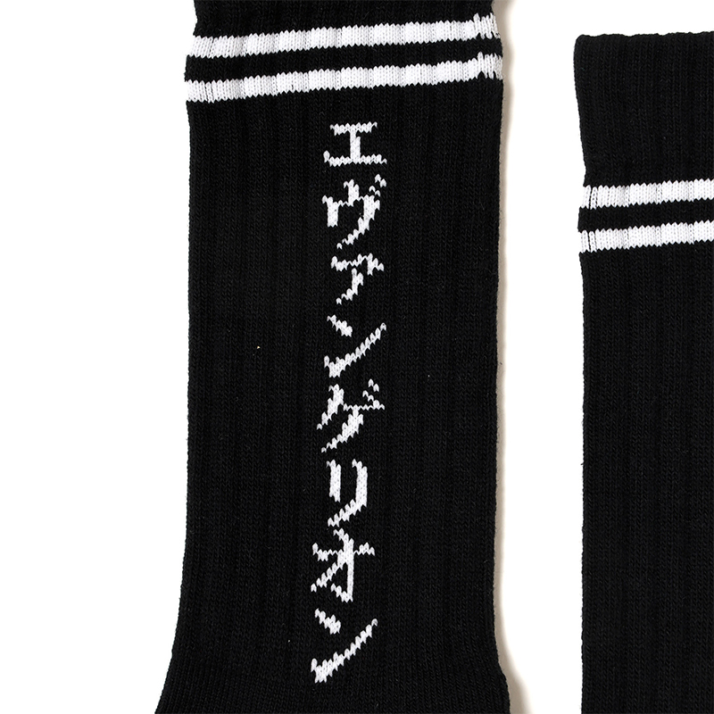 今回、RADIO EVAからオススメするソックスは、エッジの効いた見た目から海外で注目されている"カタカナ”を採用。「エヴァンゲリオン」と縦に刺繍することで、文字自体を1つのグラフィックとして落とし込みました。