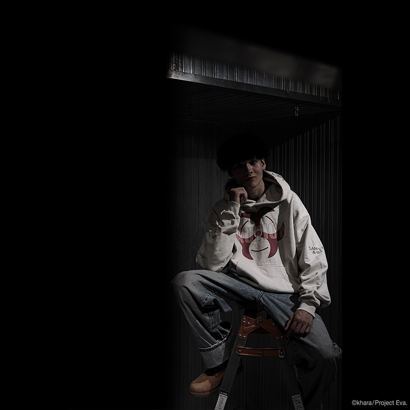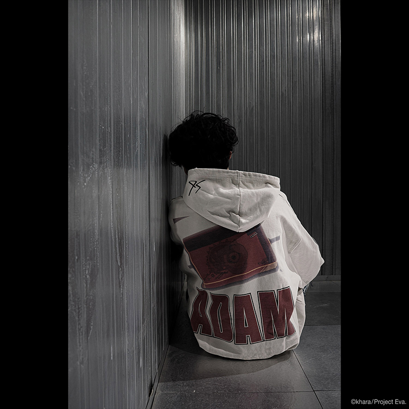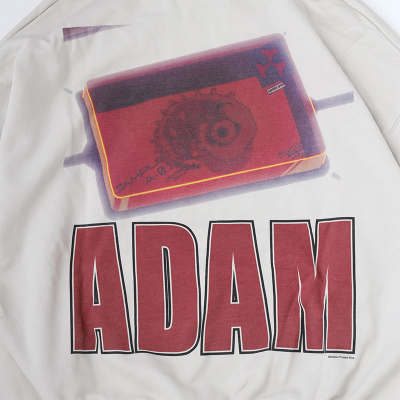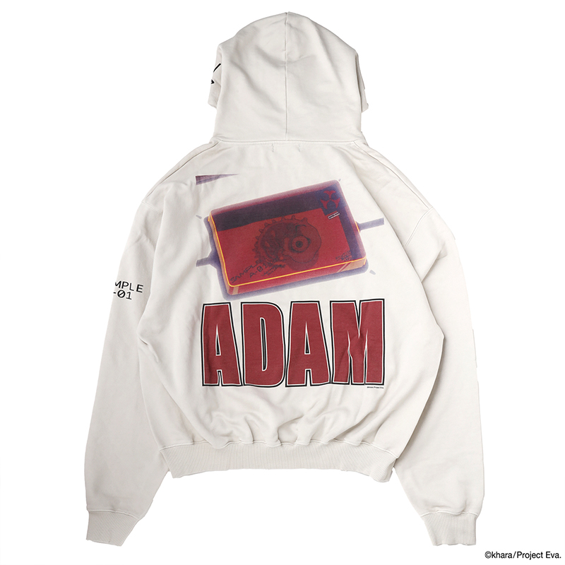 背面にはインパクトあるアダムのシーンカットとADAMの文字をデザイン。フロントにはアダムの入ったケースに明記されたCAUTIONマークをプリント。袖には同じくケースに入ったSAMPLE A-01を、そしてフードにはEVANGELION:95のアイコン"95"をプリントしました。