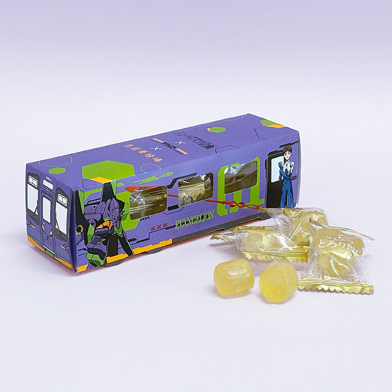 長坂養蜂場の大人気商品「はちみつとろり飴」を、「天竜浜名湖鉄道エヴァンゲリオンラッピング列車」を模したパッケージに詰めました。