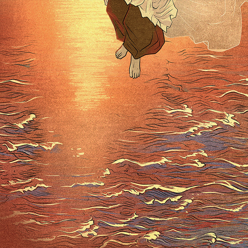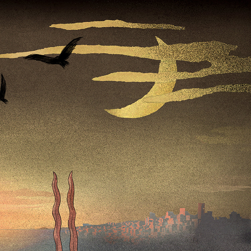 海へと沈みゆく夕日と月を対置し、「天地」「終わりと始まり」といった対概念を暗示させる構成を採用。 遠景には崩壊した世界を思わせる都市景観を配し、紅く染まる海が果てしなく広がることで、作品世界の終末性と壮大さを強調しています。