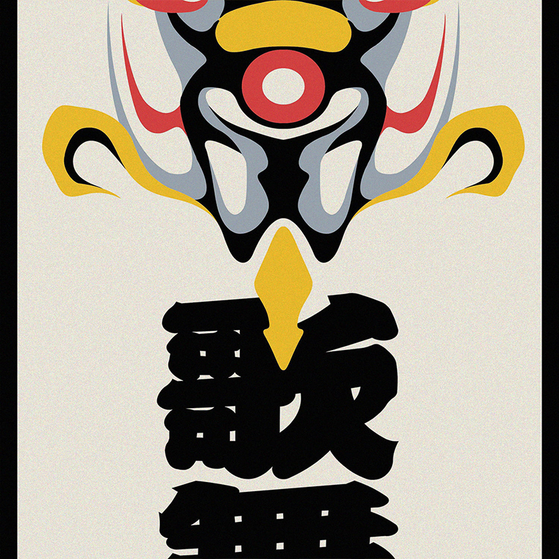 縦長の画面構成の中で、力強い題字と仮面性を帯びた造形が呼応し、新世紀と伝統が鮮やかに交差します。