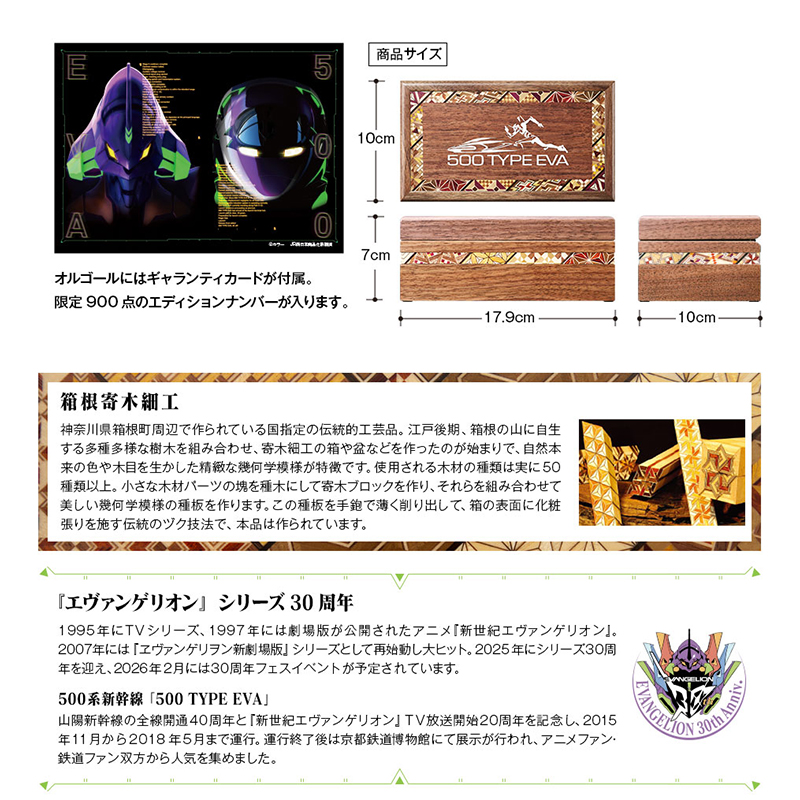 物語の舞台「第3新東京市」のモデルとなった箱根より、伝統的工芸品・箱根寄木細工のオルゴールが登場しました。