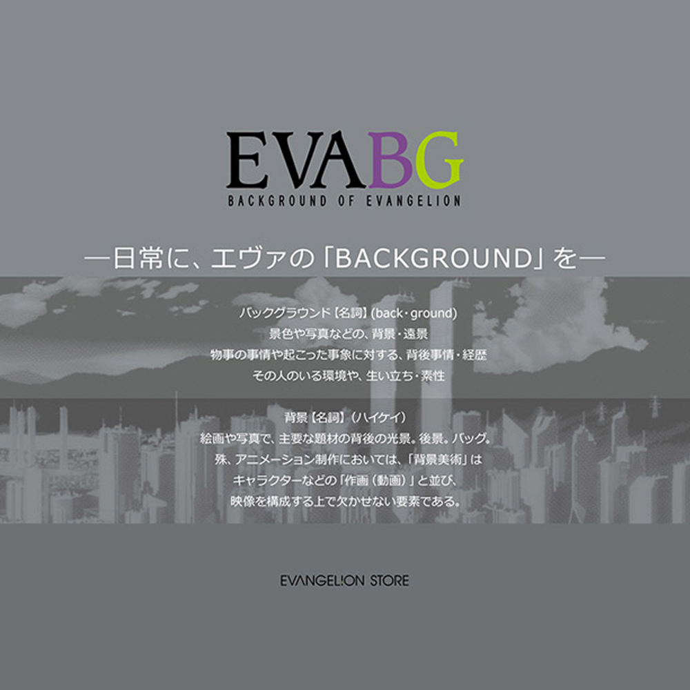 「EVA BG(エヴァ・ビージー)~BACKGROUND OF EVANGELION~」はアニメーションに「背景」が不可欠であるのと同様に、「エヴァンゲリオン」の【背景=BACKGROUND】が私たちの日常生活に不可欠な【背景】となるようなデザイン、アイテムをコンセプトに誕生したオフィシャルストア「EVANGELION STORE」発の新たなブランドです。