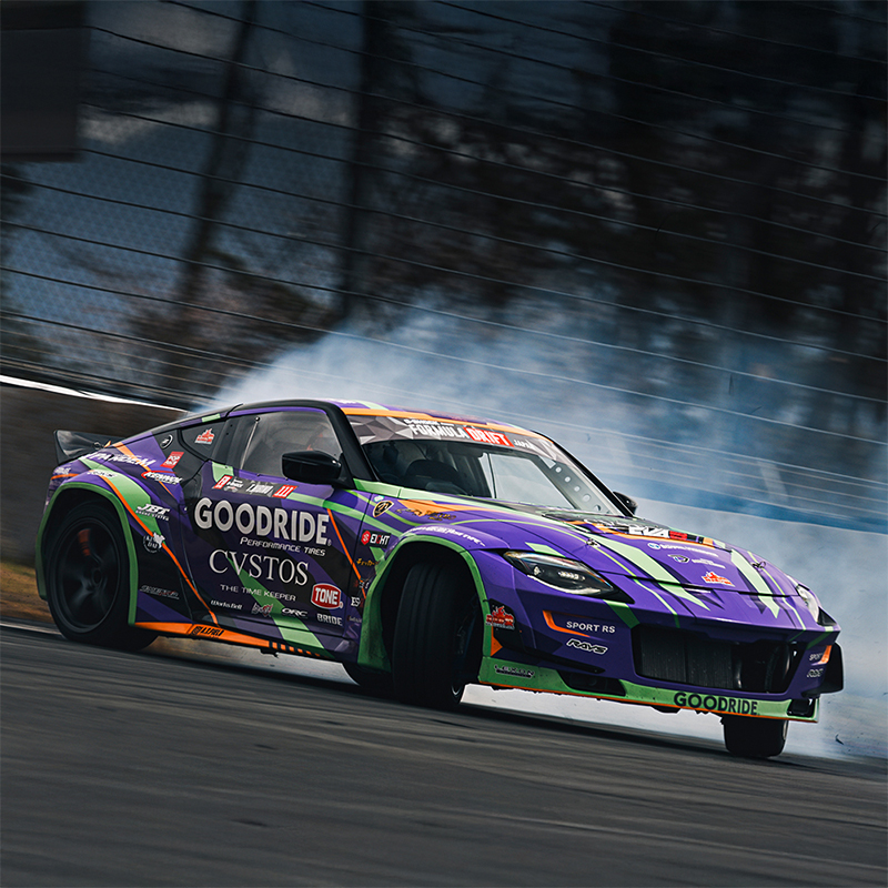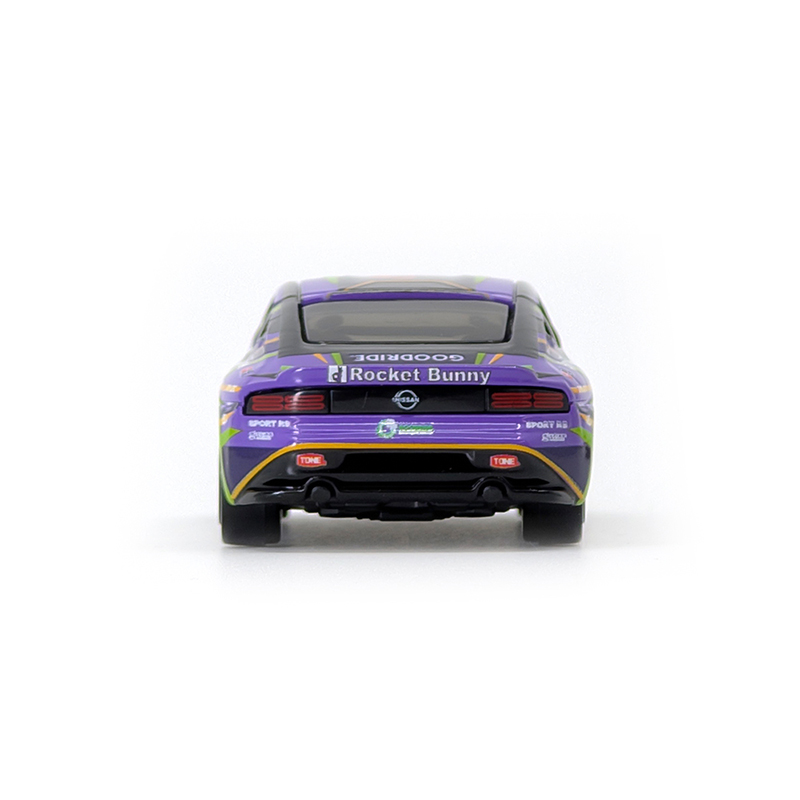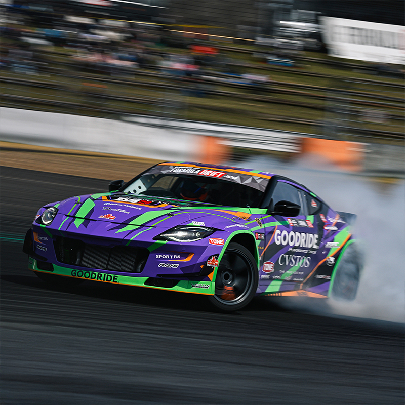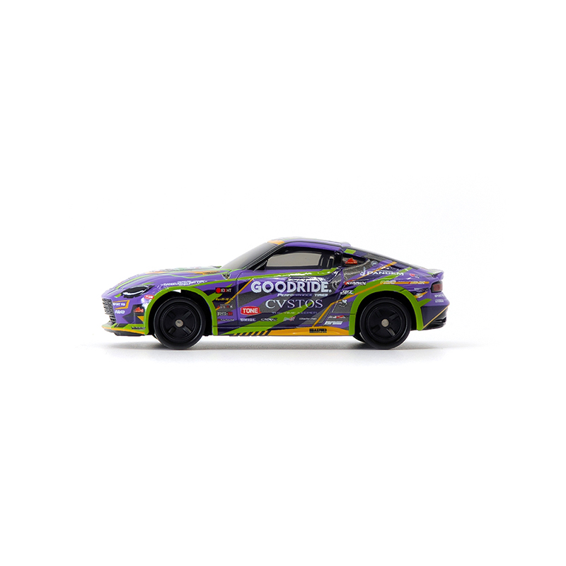 - 本商品は2024年にエヴァンゲリオンレーシングとGOODRIDE MOTORSPORTSがタッグを組み、アメリカ発祥のドリフト競技であるFORMULA DRIFT JAPAN 2024にシーズン参戦した際の競技車両「エヴァRT初号機 GOODRIDE フェアレディZ(ドライバー/日比野哲也)」をモチーフとしており、タンポ&UV印刷の技術によって再現された細かなグラフィックやスポンサーロゴなど、ディテールにこだわった仕上がりとなっています。