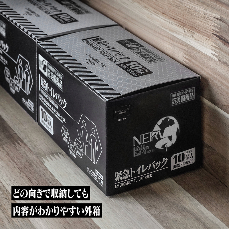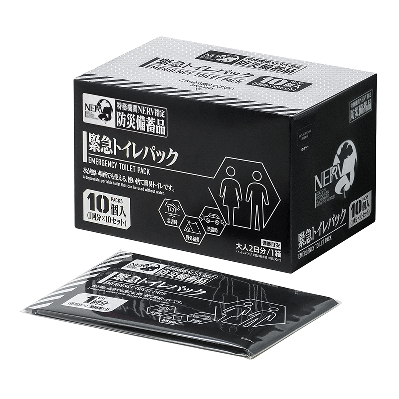 - ワークブランドA.T.FIELDより、『エヴァンゲリオン』シリーズの意匠を取り入れた防災備蓄品を開発するプロジェクト「特務機関NERV指定防災備蓄品計画」から、水が無くても使える使い捨て簡易トイレ「特務機関NERV指定 緊急トイレパック 10個入」が登場。