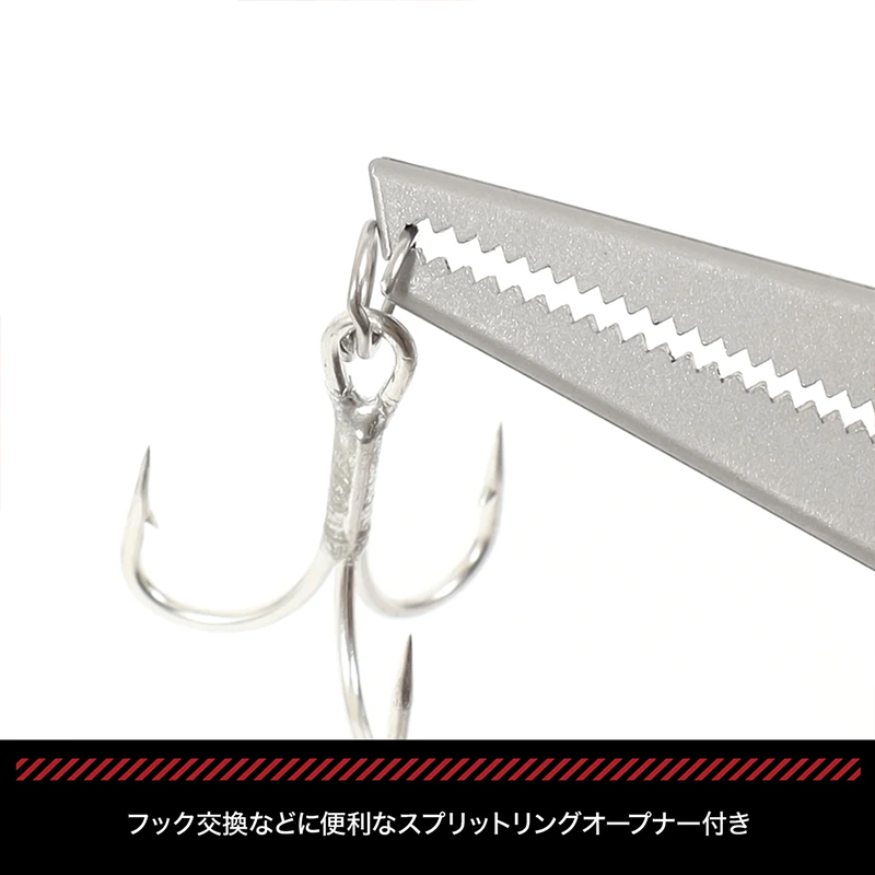 また、PEラインもスムーズにカットできる高性能ラインカッターを搭載し、スプリットリングオープナー機能でルアーのフック交換も簡単。