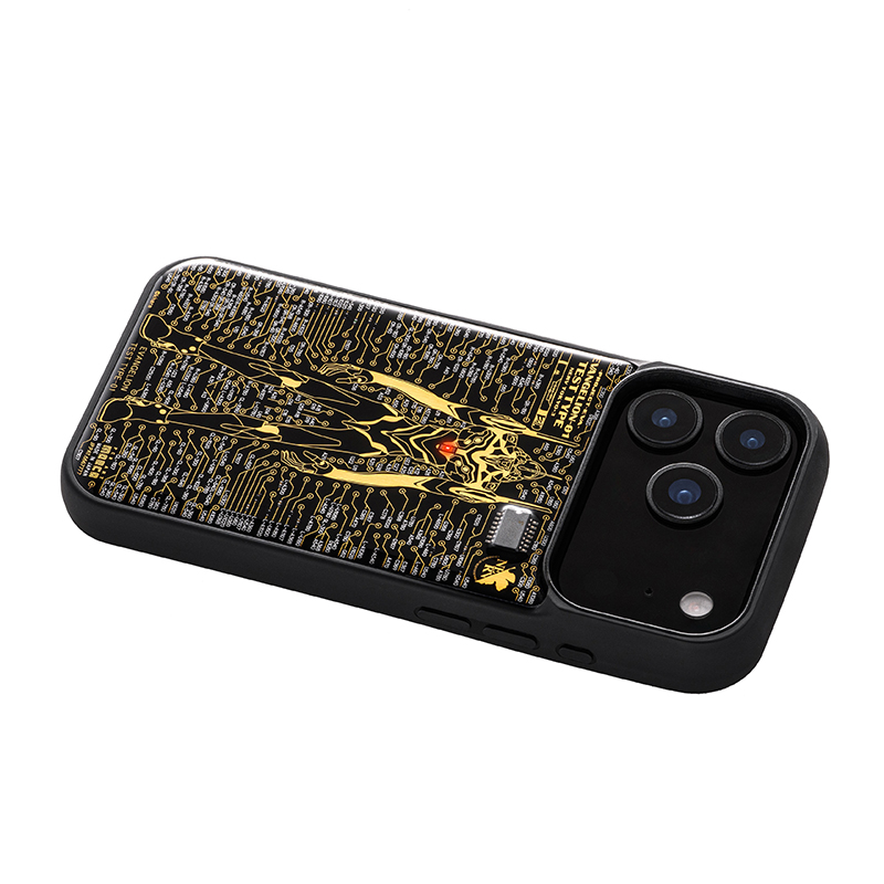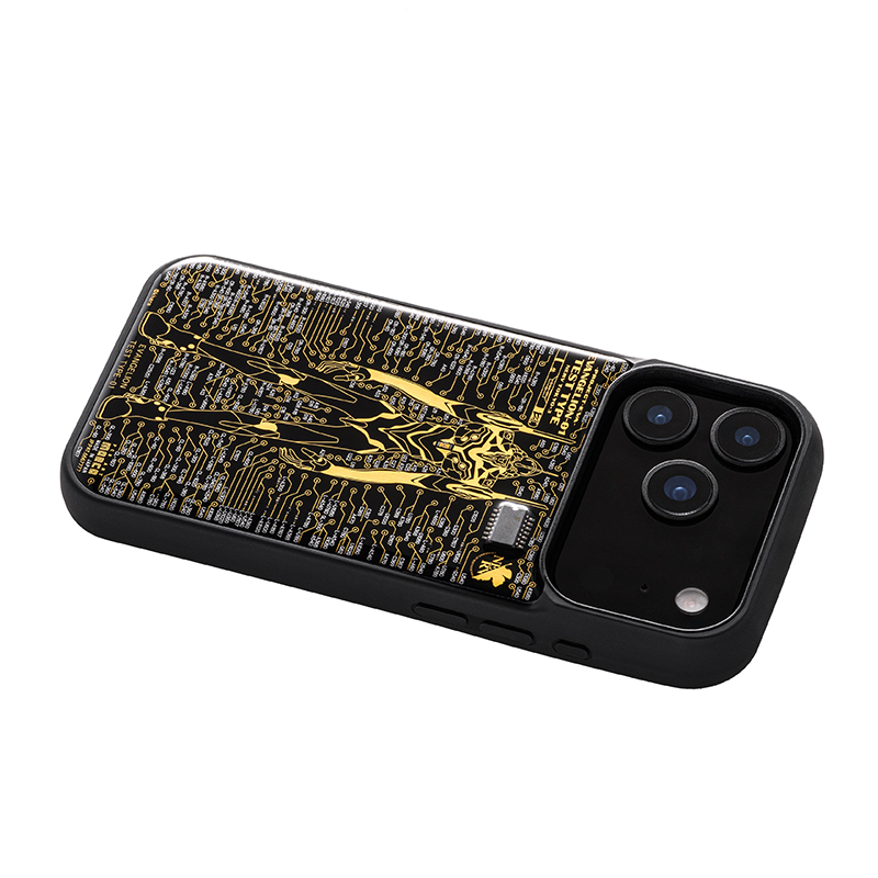 FLASH EVA01 基板アートiPhoneケースは、「エヴァンゲリオン初号機」モデル。電池を使用せず、初号機胸部のコア部に実装した2mmの赤色LEDが発光する仕様で、電子部品を合計27個実装しています。また、約14万ラインにおよぶ精緻な描写による初号機をデザイン。背景は、プリント基板の配線パターンを模した「起動実験場」のアニメシーンを基板上で表現しました。最細0.1mmの配線パターンを用い、細部までこだわった設計となっています。基板は金メッキ処理をしています。電子部品を実装後、クリーンルーム(クラス1000)で超クリアな樹脂で封止し、美しい外観に仕上げました。
